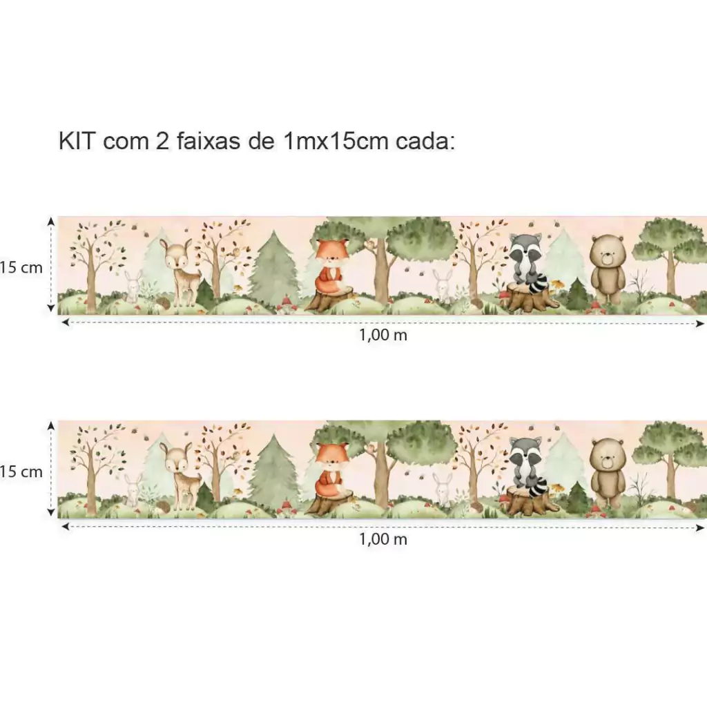 TAGs: faixa decorativa, faixa de border, faixa adesiva de parede, bosque, bosque encantado, raposa, veado, coelho, guaxinim