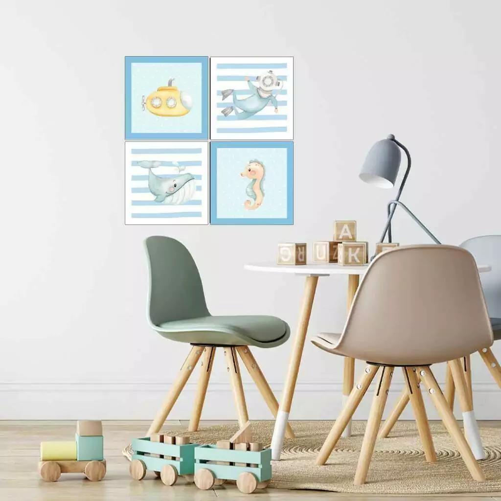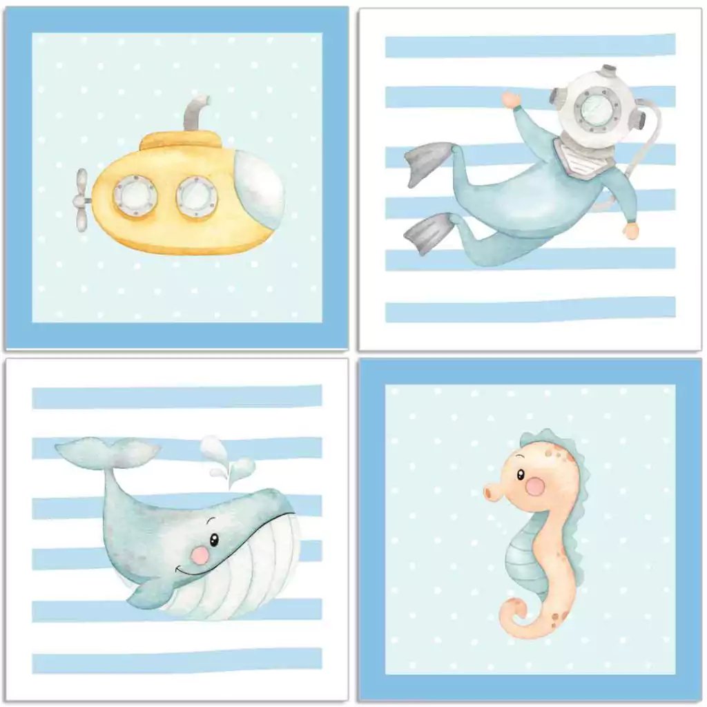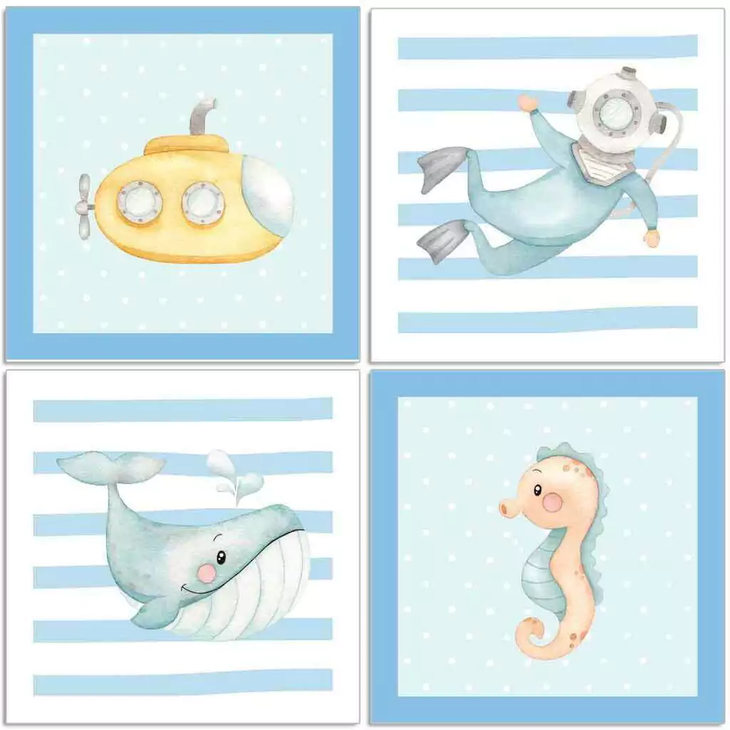 TAGs: fundo do mar, peixe, polvo, agua viva, baleia, cavalo marinho, menino, aquarela, mergulhador, submarino