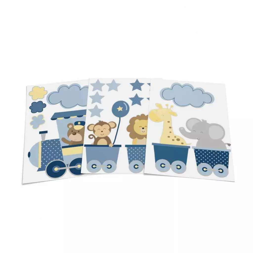 TAGs: safari trem, trenzinho safari, leão, macaco, urso, girafa, elefante, arvore, sinal, cruzamento, trilhos, azul, verde, amarelo, menino