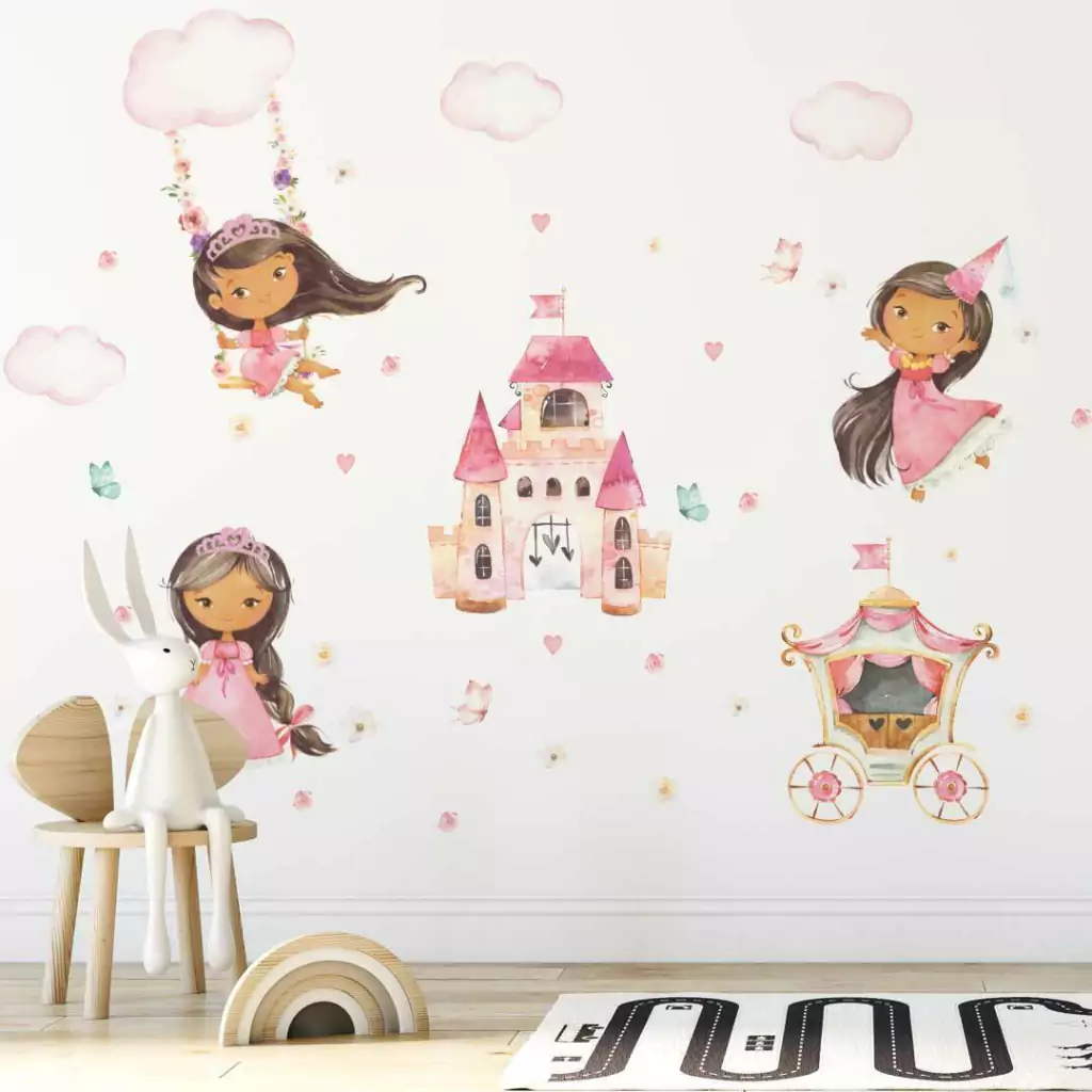 TAGs: menina princesa, realeza, adesivo grande, menina realeza, princesinha, morena, nuvens, nuvem, borboleta, menina, rosa, corações, carruagem, castelo encantado, flor, flores