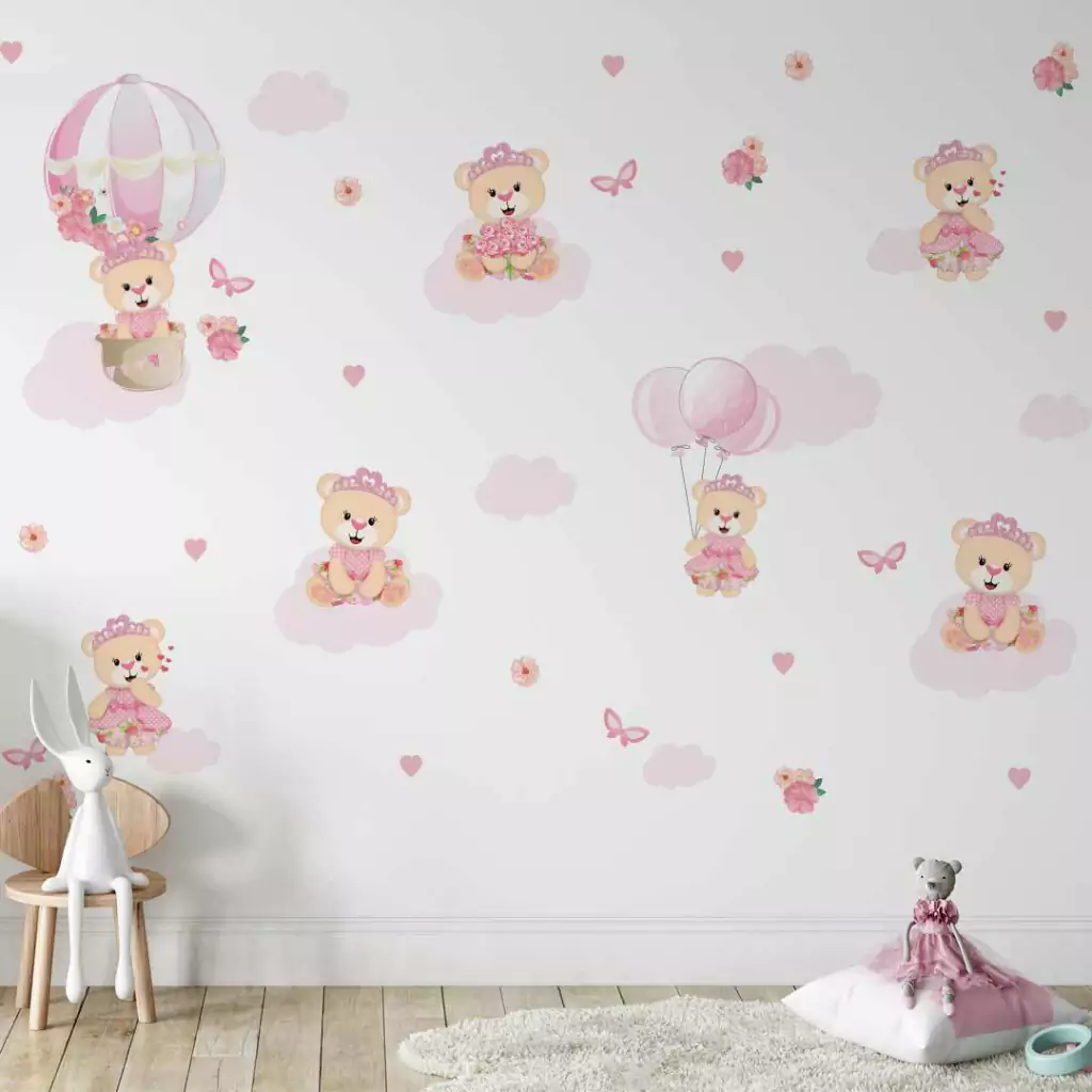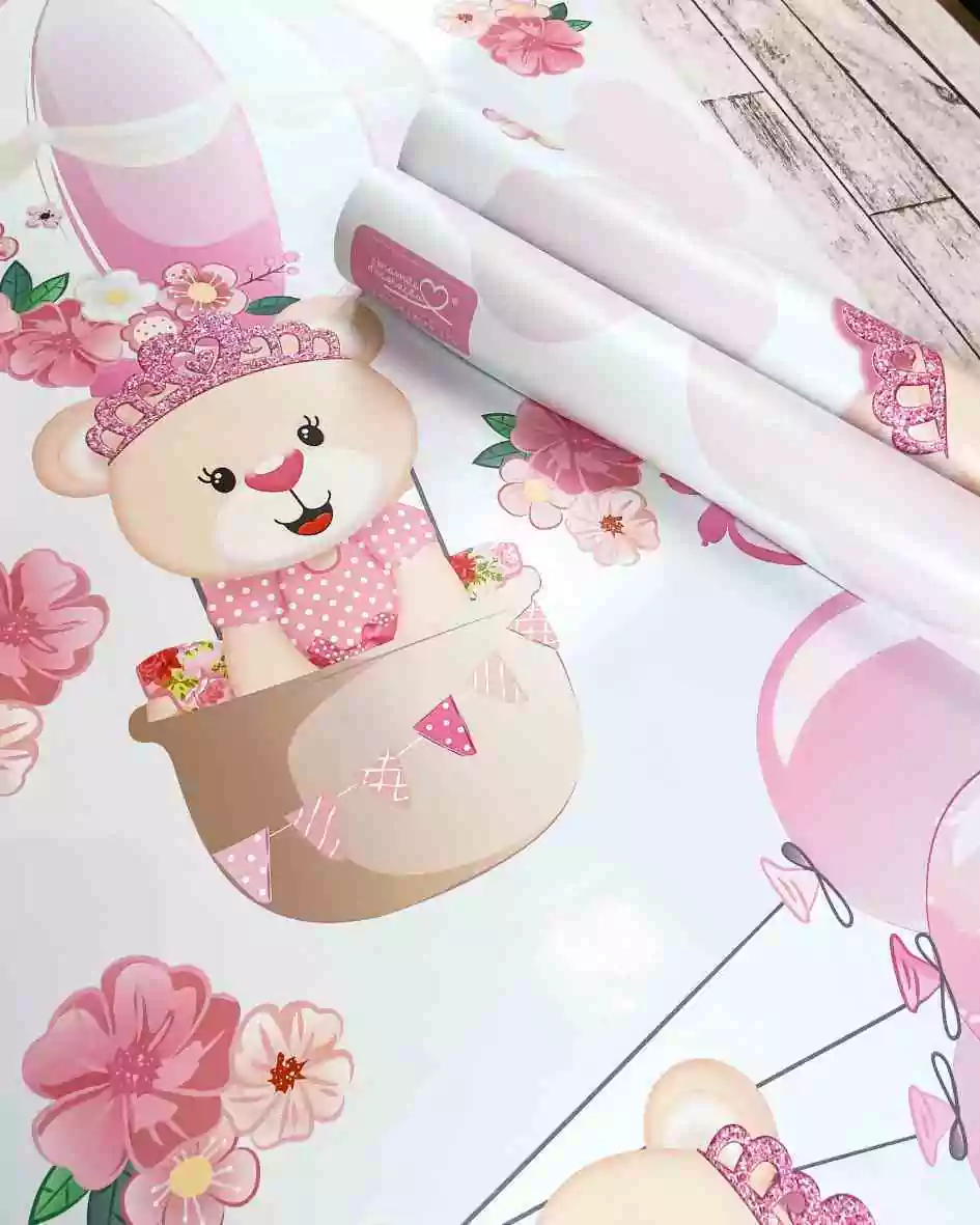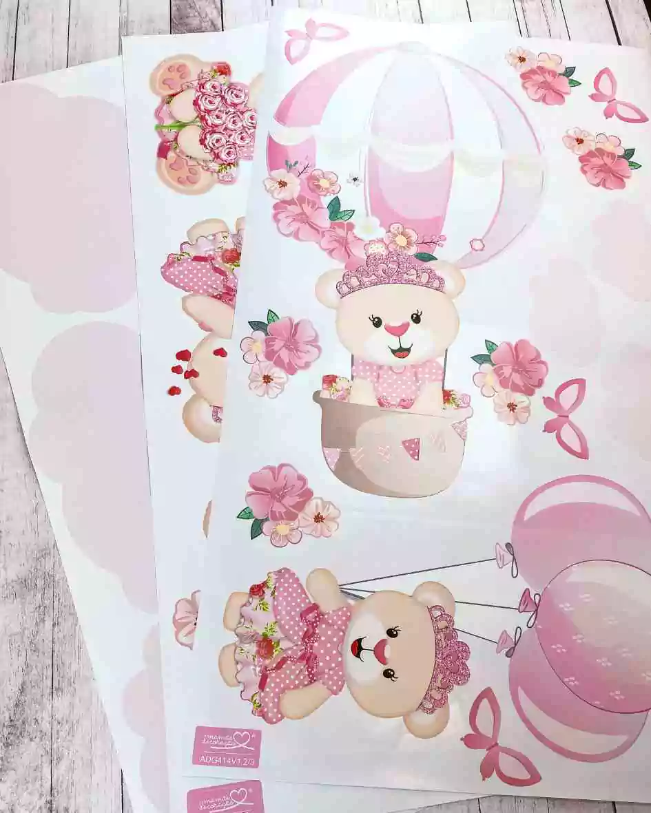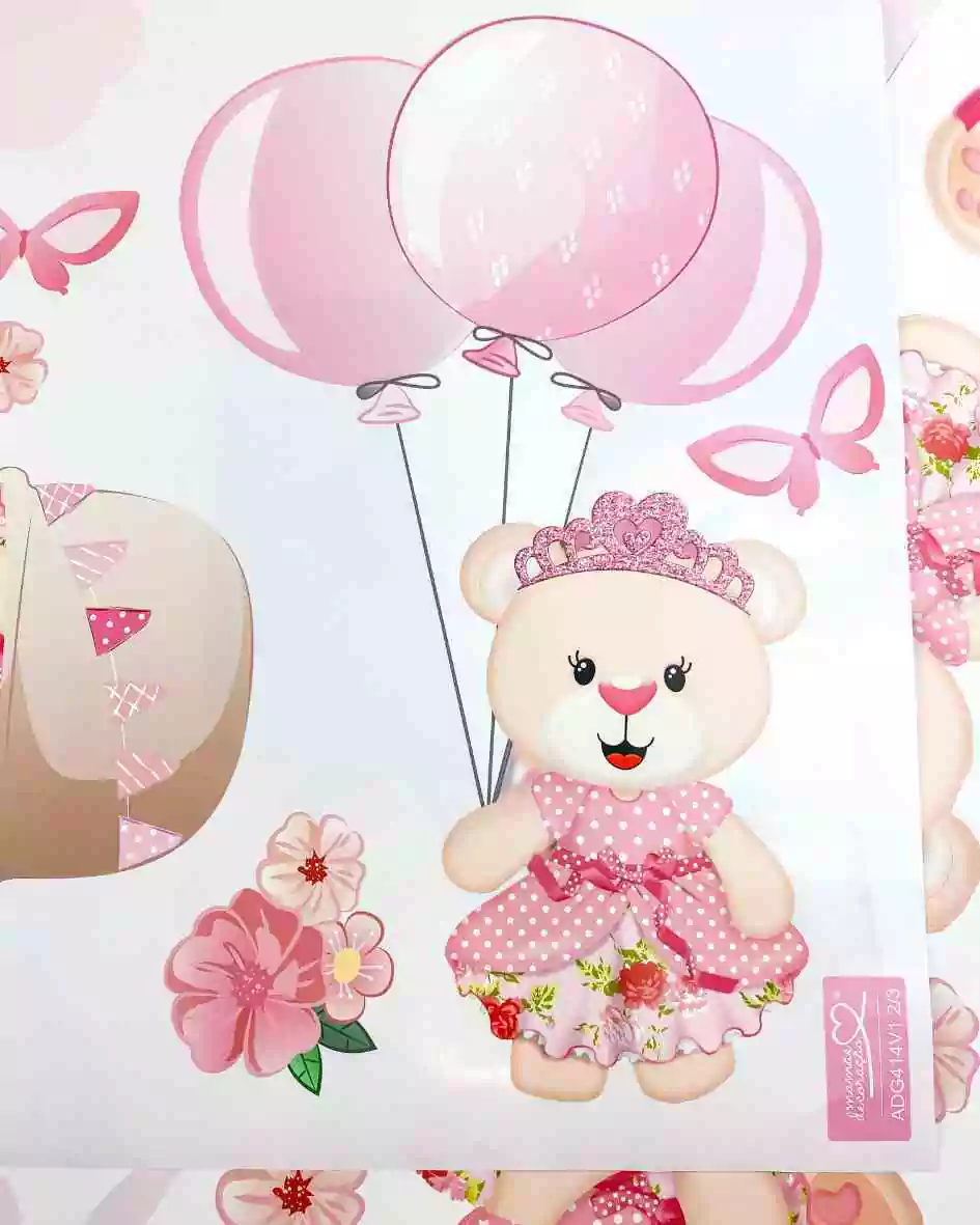 TAGs: ursa, ursinha princesa, ursinha realeza, adesivo grande, ursinha baloeira, balão, nuvens, nuvem, borboleta, menina, rosa, corações