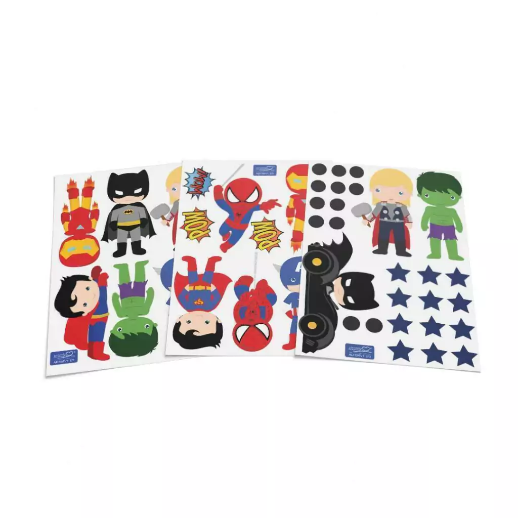 Adesivos: - Modelo: Super Heróis - Kit de adesivos com 3 cartelas - Quantidade de adesivos: 20 unidades - Medidas: 1 Super-Herói 19cm, 2 Estrelas 13cm, 5 Nuvens 14cm, entre outros - Material: Adesivo fosco - Aplicação: Adesivos individuais, destaque e aplique na parede