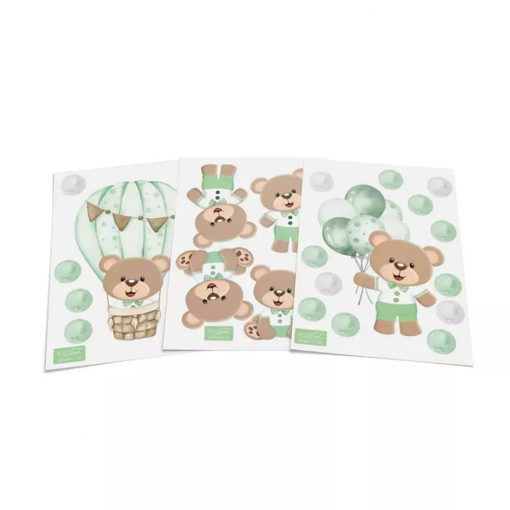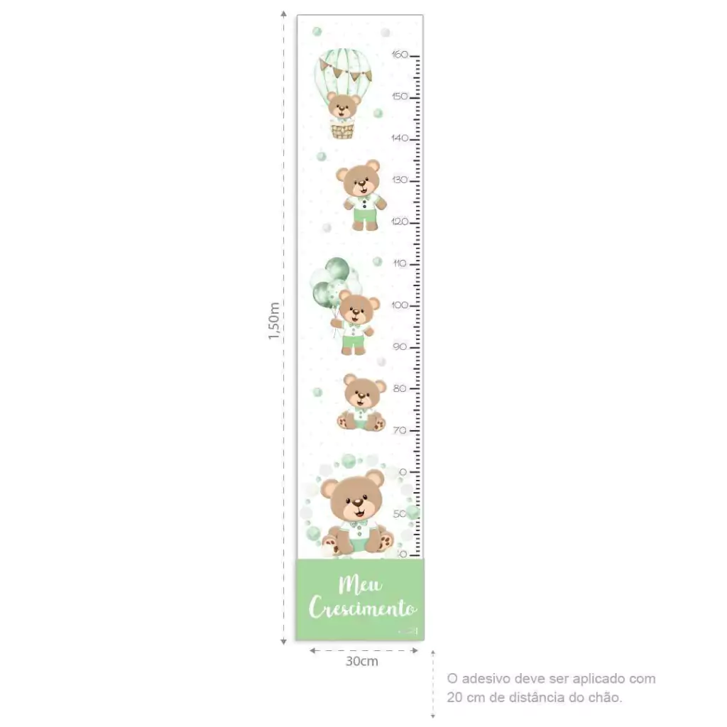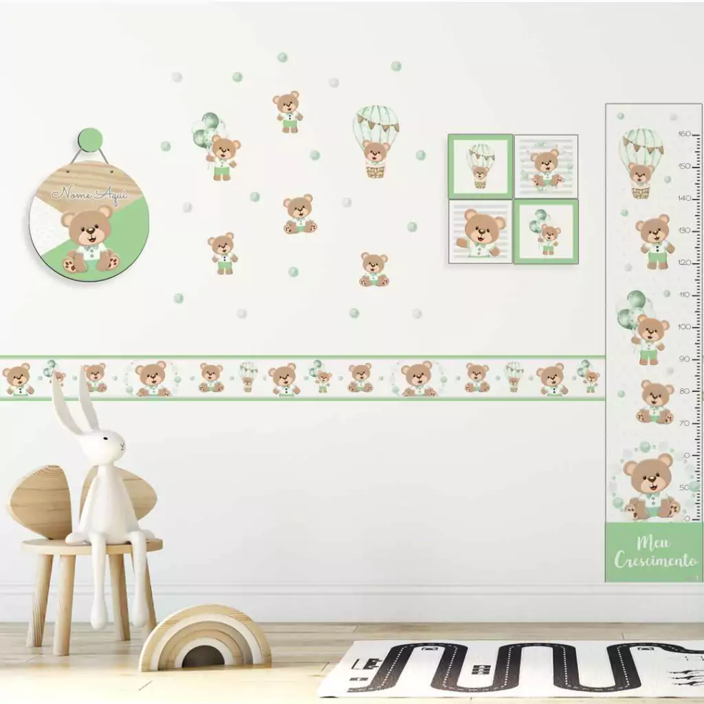 TAGs: adesivo, adesivo de parede, combo, kit, kit decoração, enfeite de porta, faixa, faixa adesiva, régua de crescimento, ursinho, ursinho baloeiro, balão, balões, verde, menino