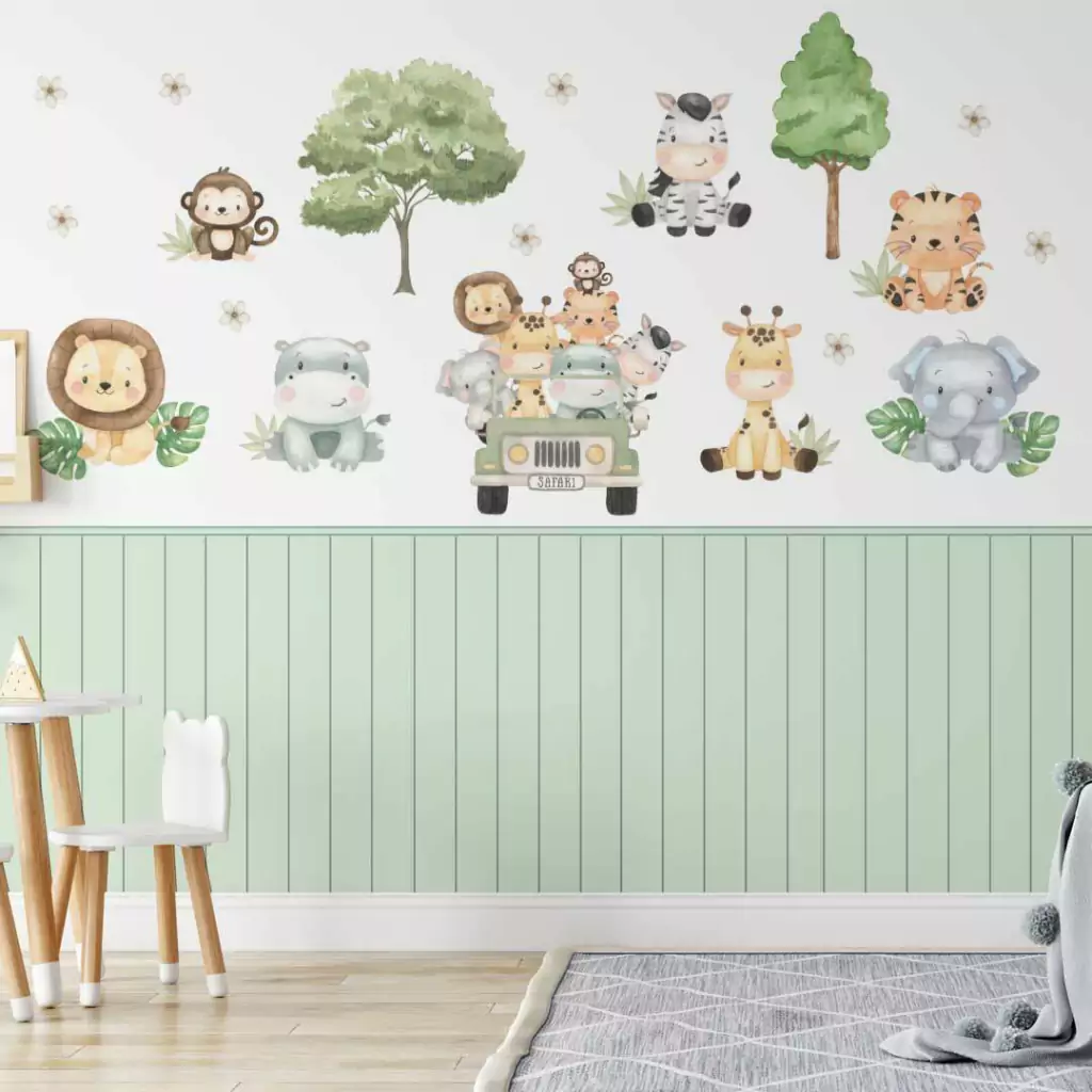 Renove o ambiente do seu quarto de bebê ou espaço infantil com o encantador Kit Painel Decorativo Safari Jipe Aquarela. Com adesivos de alta qualidade, este kit traz uma atmosfera lúdica e divertida para as paredes. Com figuras adoráveis como leão, elefante, hipopótamo e muitos outros, cada adesivo é um convite para a imaginação. Aplique facilmente os adesivos individuais, destacando e posicionando conforme sua preferência.