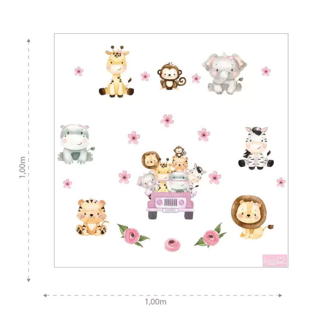 Cobertura do Kit: O Kit Safari Jipe Aquarela Rosa com Nome Personalizado em Adesivo cobre uma parede de até 2,30 metros de largura (incluindo a régua), proporcionando uma decoração completa e impactante.