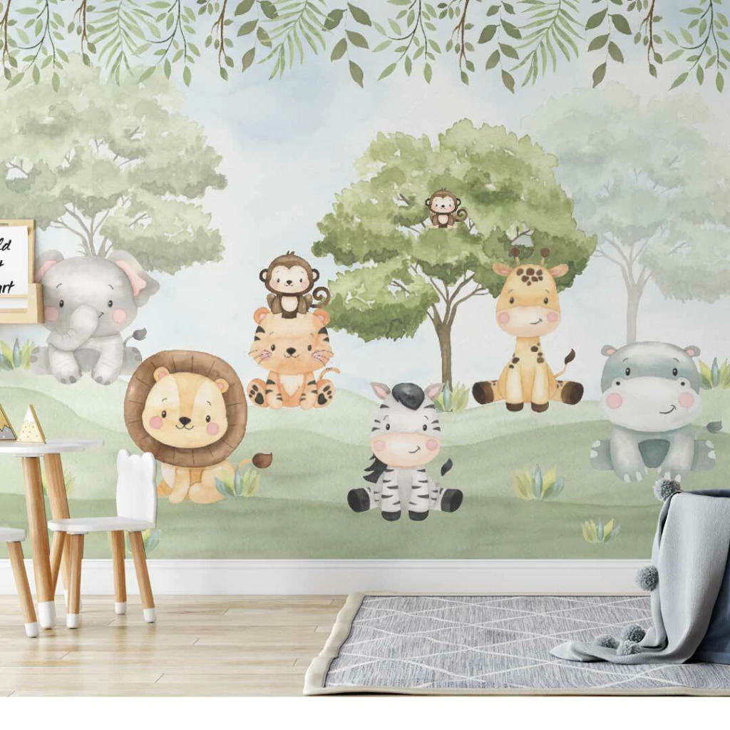 Este modelo traz uma composição delicada e lúdica dos animais mais amados da selva, em uma paisagem serena com cores suaves e toque aquarelado — perfeito para criar um ambiente cheio de ternura, alegria e imaginação.