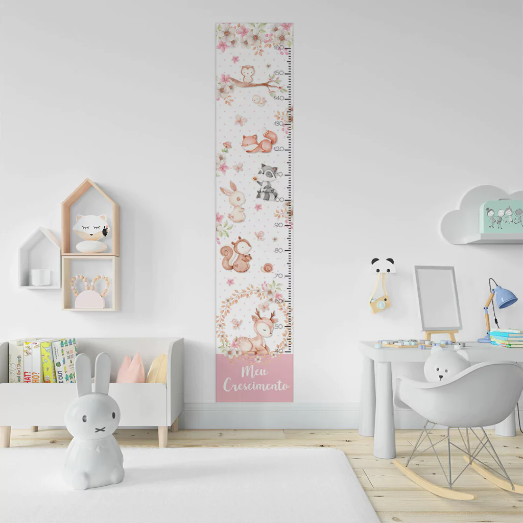 TAGs: régua de crescimento, régua adesiva, bosque, bosque encantando, menina, esquilo, guaxinim, cervo, bambi, coelho, raposa, coruja, passarinhos, floresta, floresta mágica, menina